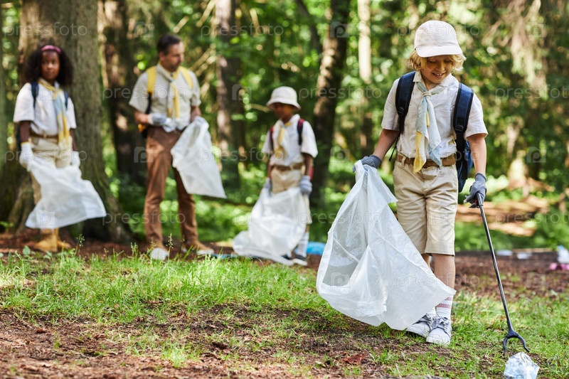 Милый бойскаут помогает очистить лес и держит мусорный мешок