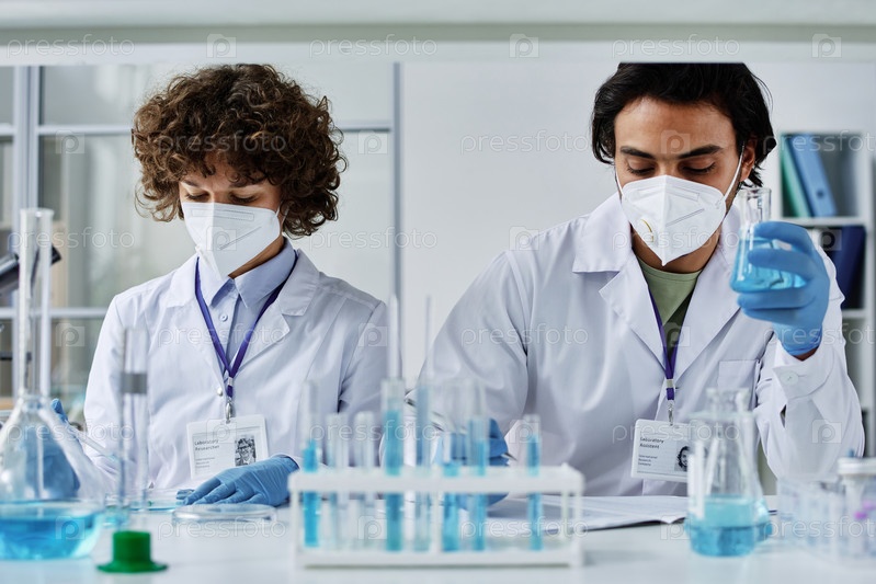 Два молодых клинициста в лабораторных халатах, респираторах и перчатках работают с жидкостями
