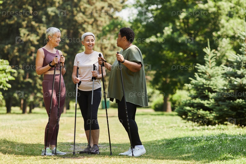 Активные пожилые женщины с ходовыми палками, беседующие на открытом воздухе и улыбающиеся