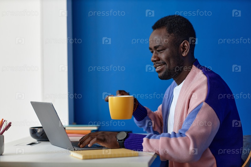 Чернокожий мужчина использует ноутбук на рабочем месте в офисе с часами на синей стене
