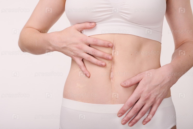 Женщина показывает свой шрам на животе