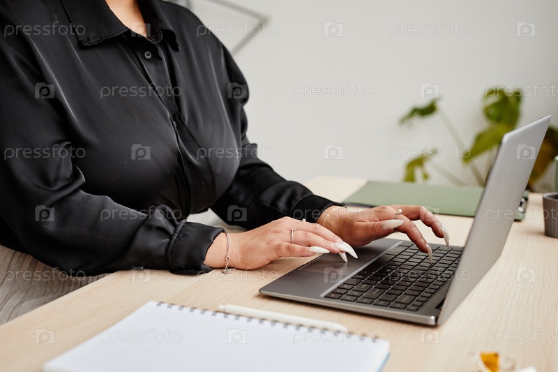 Женщина с маникюром печатает на клавиатуре