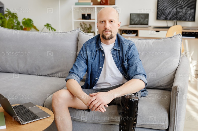 Мужчина с протезированной ногой смотрит на камеру, сидящий дома на диване