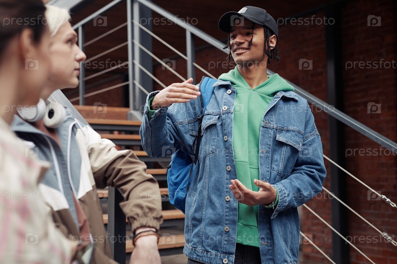 Молодой улыбающийся чернокожий мужчина в повседневной одежде стоит на лестнице у кирпичной стены