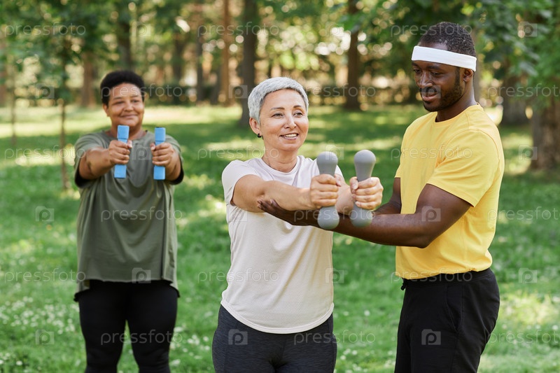 Мужской спортивный тренер помогает улыбающейся зрелой женщине
