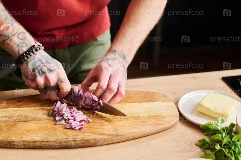 Человек, режущий красный лук за столом