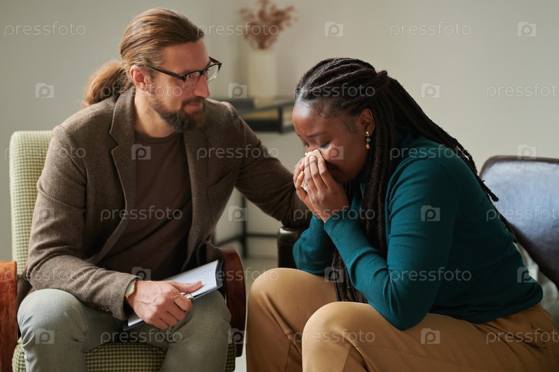 Женщина в депрессии разговаривает с психотерапевтом