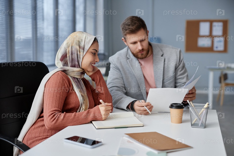 Два молодых межкультурных экономиста обсуждают финансовые документы по рабочим местам