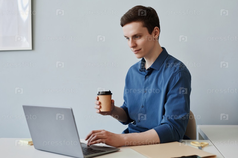 Улыбающийся молодой человек использует ноутбук на рабочем месте в офисе и наслаждается чашкой кофе