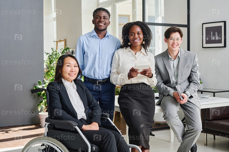 Мультиэтническая бизнес-команда стоит в офисе