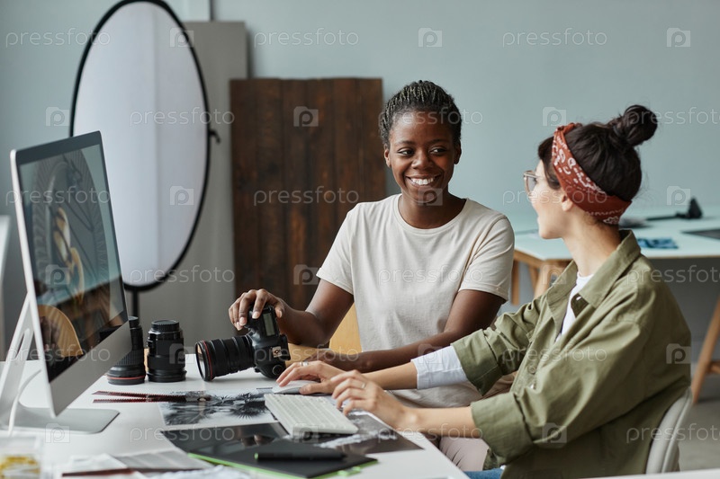 Команда женщин-фотографов, обсуждающих фотографии