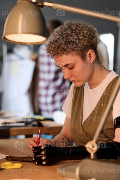 Серьезный молодой дизайнер моды делает эскизы в блокноте на рабочем месте