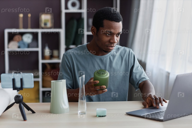 Молодой мужской блоггер держит ручной вазу во время онлайн-мастеркласса