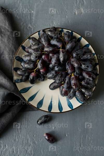 Зрелые черные виноград на тарелке