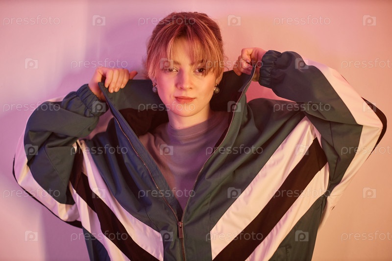 Молодая девушка, одетая в большой ретро куртку с эстетикой 80-х годов