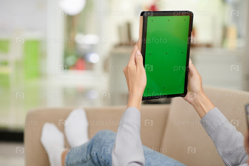 Близкий план молодой современной женщины в повседневной одежде, держащей таблетку с зеленым экраном