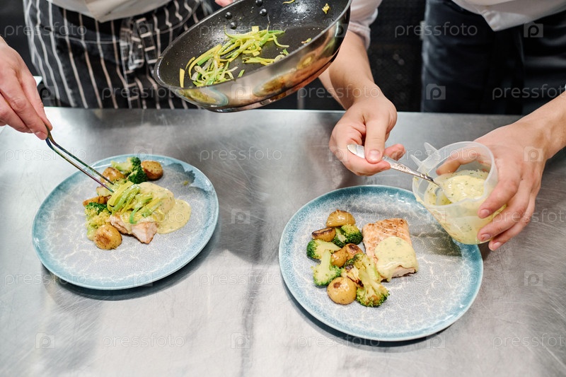 Шеф и повар ставят блюдо на тарелку