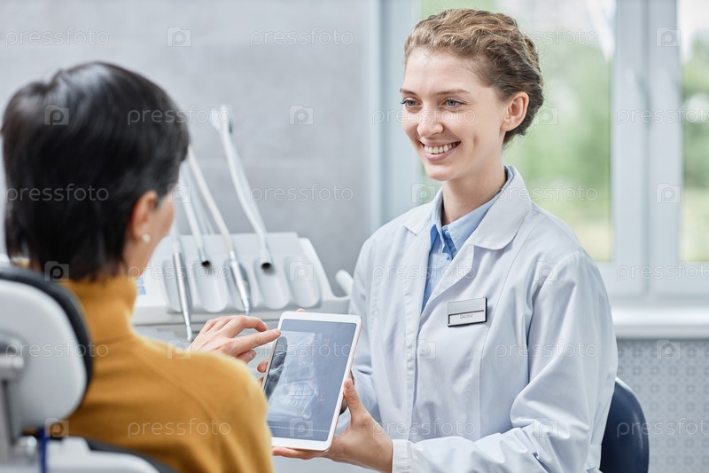 Портрет улыбающейся женщины-стоматолога, показывающей рентгеновские снимки пациенту