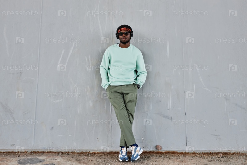 Молодой чернокожий мужчина в одежде уличного стиля, опирающийся на бетонную стену