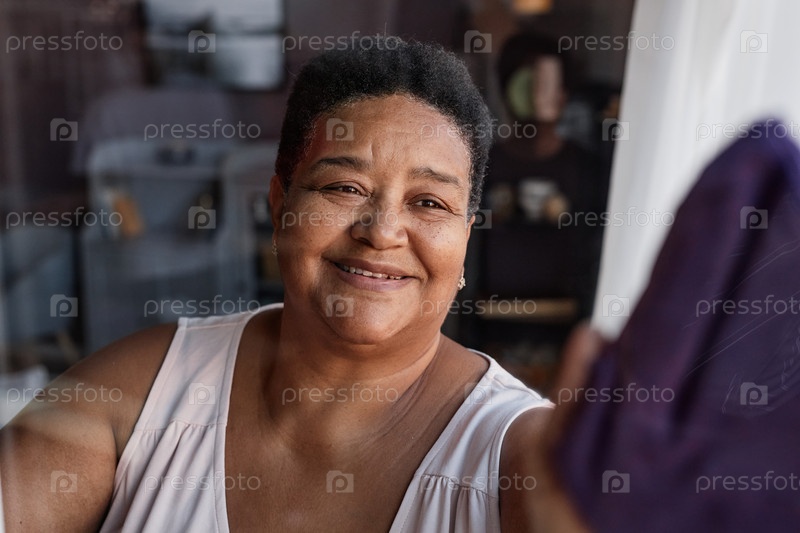 Чернокожая старшая женщина моет стеклянные окна