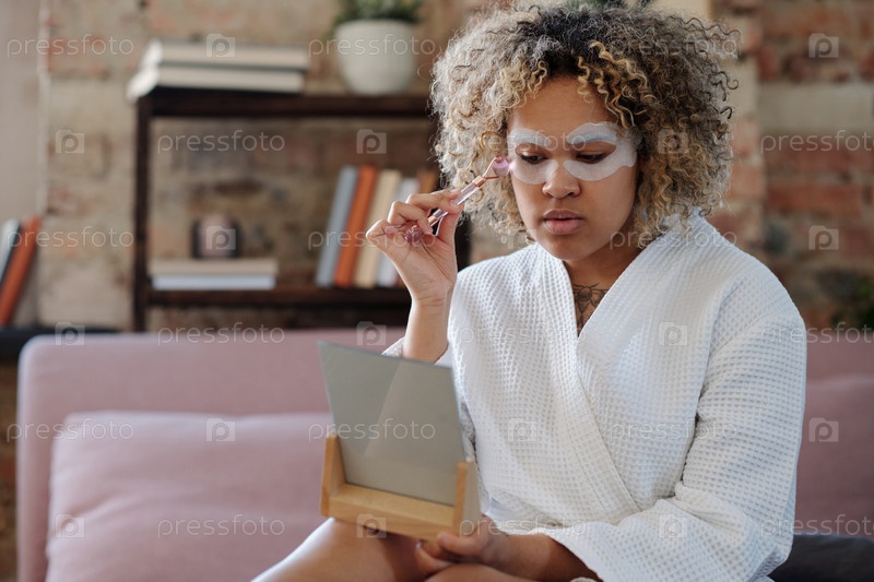 Афроамериканская девушка делает процедуру по уходу за кожей с помощью кварцевого ролика