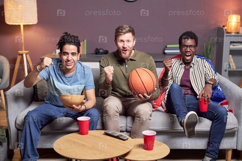 Разнообразная группа друзей, смотрящие спортивные матчи дома и веселящиеся