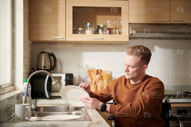 Человек в инвалидном кресле, который моет посуду