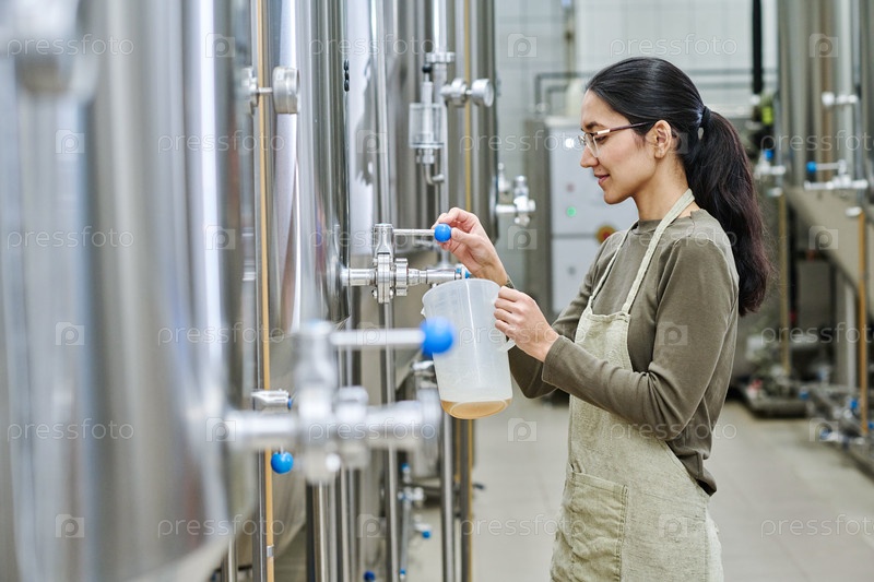 Работник наливает сваренное пиво в контейнер