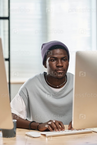 Молодой серьезный афроамериканец в повседневной одежде, работающий перед компьютером