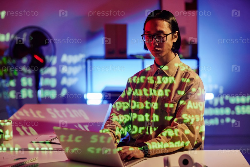Молодой азиатский программист по разнообразию мужского пола работает перед ноутбуком