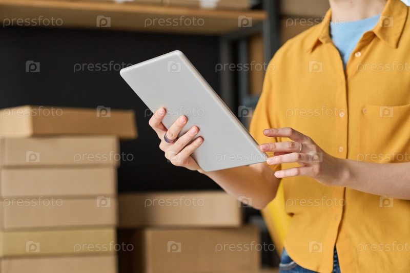 Женщина использует планшетный компьютер, чтобы проверить номер трека