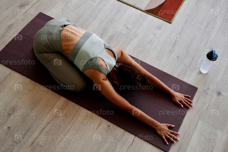 Вид сверху женщины, растягивающейся дома и наслаждающейся занятиями йогой в расслабляющем положении