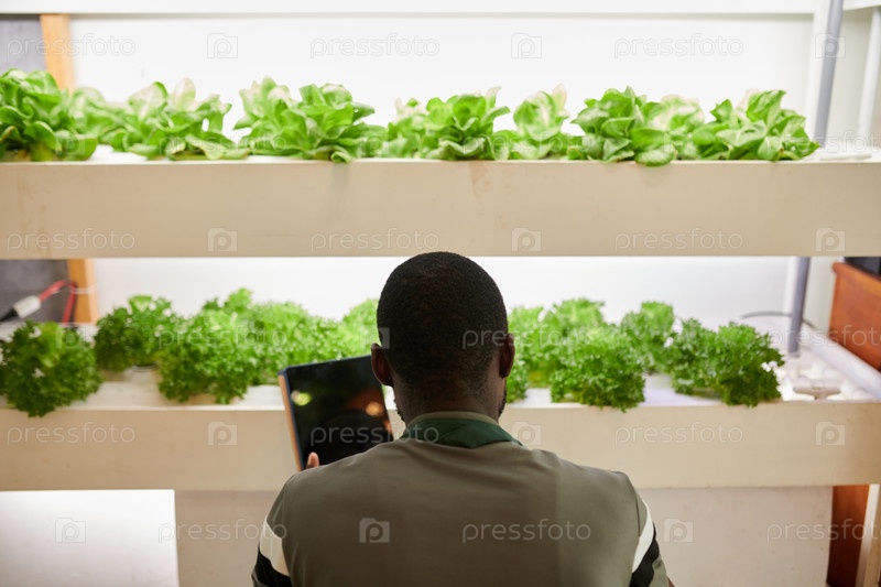 Торговец кладет салат на полки