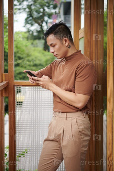Апатический азиатский молодой человек Doomscrolling