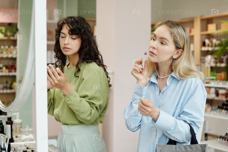 Молодая блондинка-потребитель, тестирующая консилер на лице