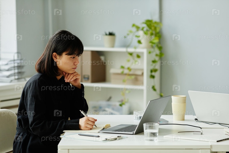 Молодая азиатская женщина, работающая в офисе Young Asian Woman Working in Office Side View