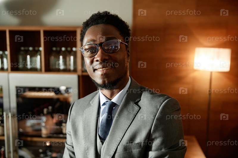 Улыбающийся молодой бизнесмен стоит в кафе
