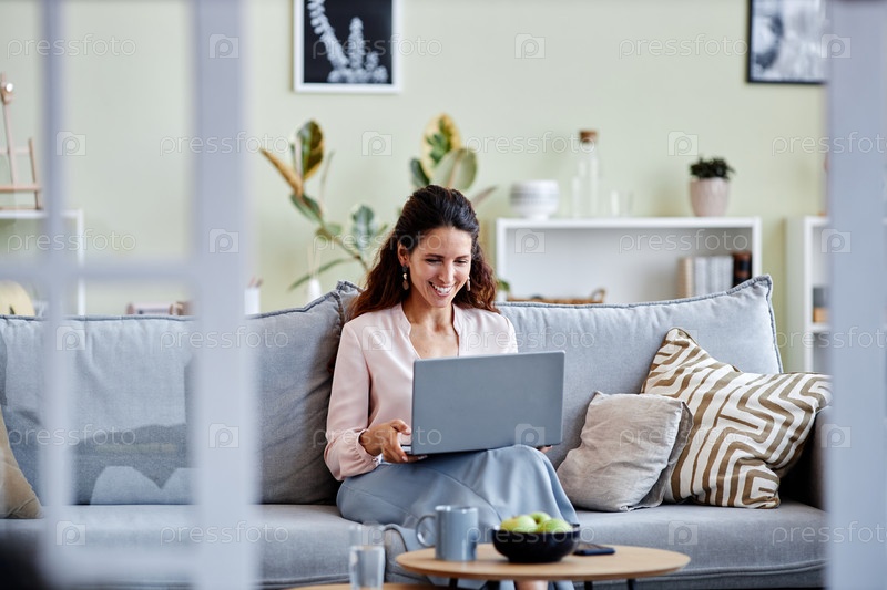 Женщина, использующая ноутбук сидя на диване дома, пользуясь интернетом или работая в Интернете