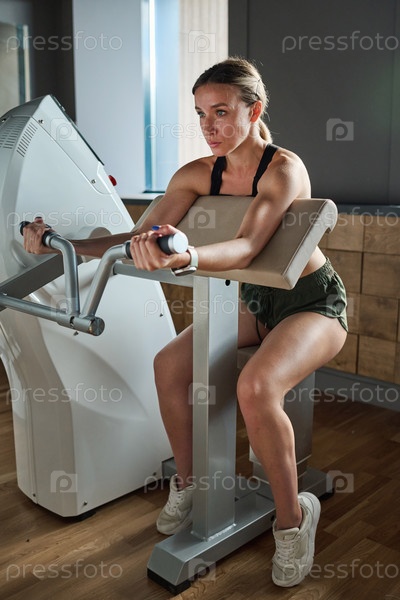 Женщина тренируется на спортивном оборудовании в спортзале