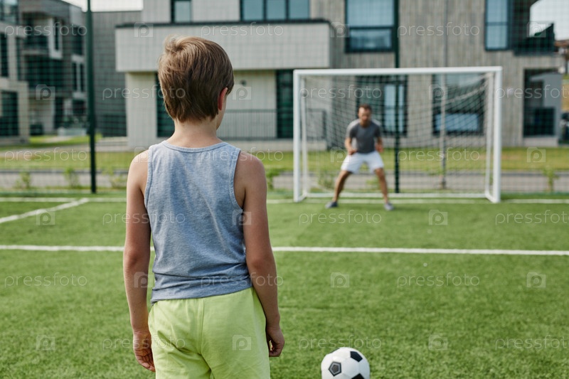 Задний вид юного мальчика, играющего в футбол с отцом