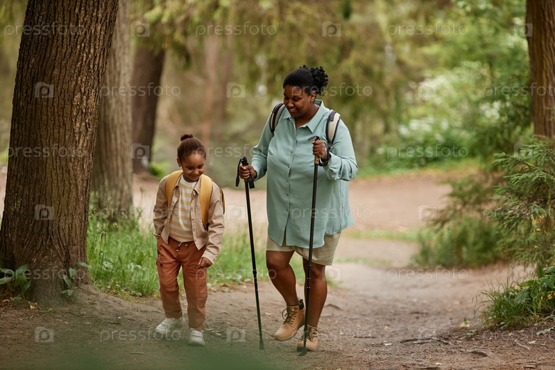 Черная мать и ее дочь вместе ходят пешком по красивой лесной тропе