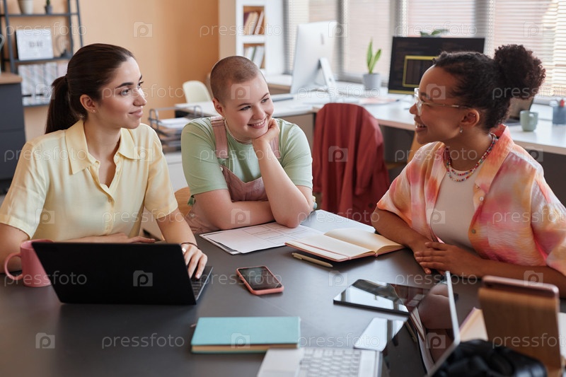 Три молодых женщины за столом заседания, которые наслаждаются совместной работой в офисе