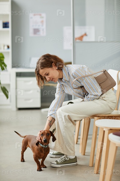 Молодая владелецка домашнего животного, ладит со своей собакой-таксюнд