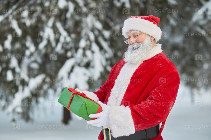 Санта Клаус держит подарок на открытом воздухе