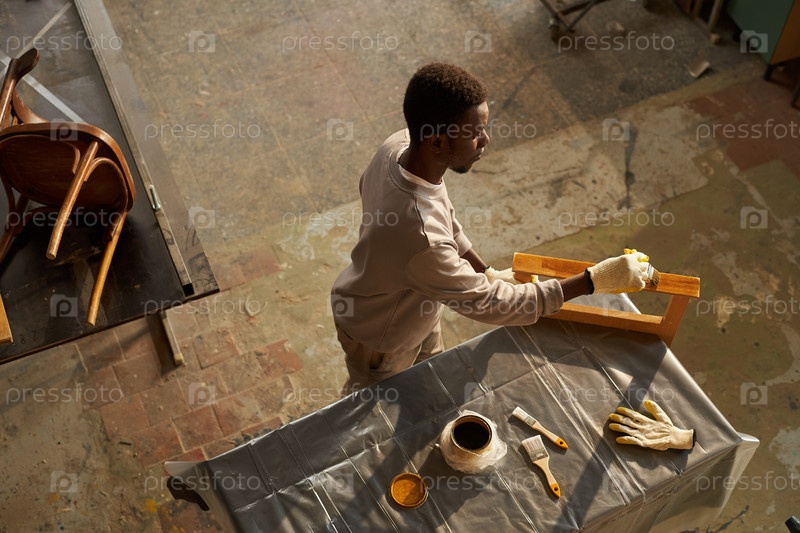 Вид сверху на молодого чернокожего мужчину, выполняющего проект по реставрации мебели