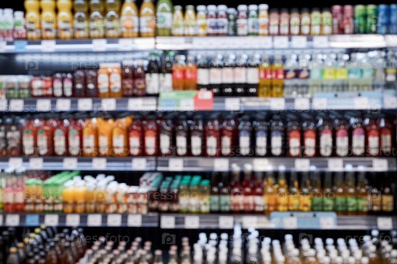 Супермаркет с полками, наложенными различными напитками в ряд