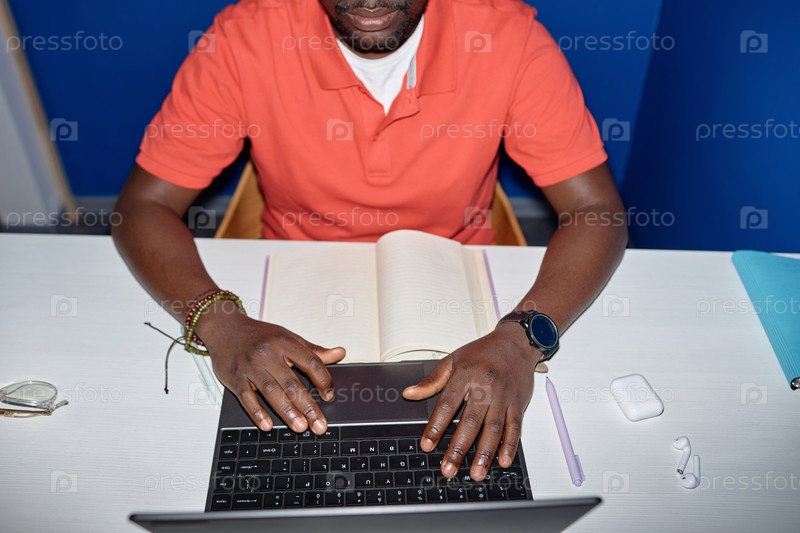 Ближайшее изображение сверху сосредоточенного чернокожего мужчины, использующего ноутбук на рабочем месте и печатающего