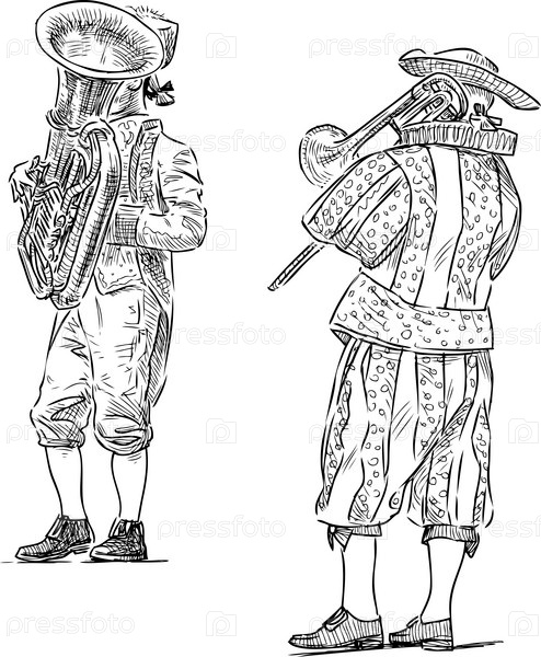 Свободный рисунок музыкантов в карнавальных костюмах, играющих на трубах