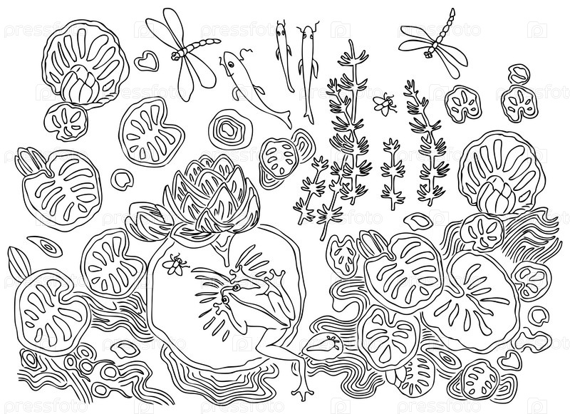 Контурный рисунок декоративных растений и животных, обитающих в лесном озере