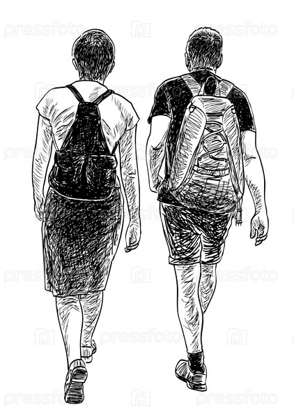 Эскиз пары туристов с рюкзаками, идущих по улице